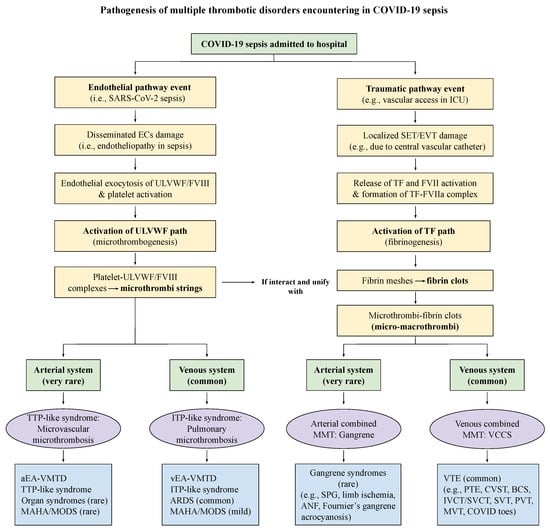 The primary clinical phenotype of thrombosis is determined by the depth, extent and location of the vascular injury and intrinsic character of thrombus formed at different vascular milieux. Further, endotheliopathy is typically associated with ECs damage occurring in the disease such as sepsis (e.g., bacterial and viral) resulting in disseminated endotheliopathy-associated vascular microthrombotic disease (e.g., EA-VMTD), but ECs/SET/EVT damage occurs with a local vascular injury such as trauma and in-hospital vascular accesses (e.g., surgery, indwelling vascular device) resulting in local macrothrombus. The former is a systemic disease due to activated ULVWF path and produces disseminated microthrombosis, but the latter is a localized disease due to activated TF path with minimum ULVWF path and produces local macrothrombosis.