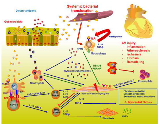 Overall, many conditions in which the immune system is dysregulated have been linked to the development of HF. These pathologies range from lupus erythematosus to diabetes and obesity [3,4,5]. Part of the changes in the function of the immune system may also not be directly determined by the inflammatory condition itself but through modifications of the gut microbiota, which is a key factor in the regulation and modulation of the immune system [6,7].