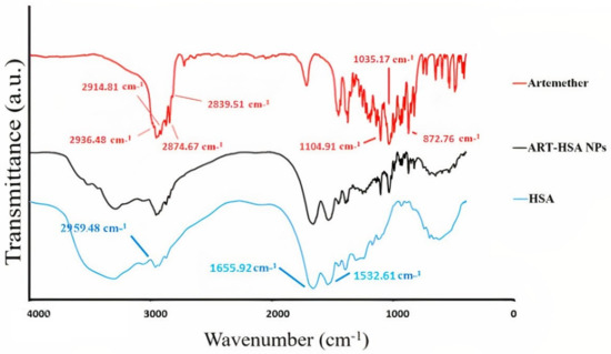 The FTIR results of artemether, albumin and ARM-Alb NPs. The presence of the main peaks of artemether and albumin in the nanoparticle structure indicates that their structure remains intact after the encapsulation process.