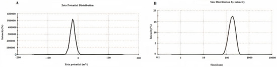 Zeta potential, PDI index, and mean nanoparticles size were determined through the DLS technique [50] (Table 1). According to previous studies, 100 to 200 nanometers is the optimal size for nanoparticles [51]. Table 1 shows that the nanoparticles in this study have a standard size (171.3 ± 5.88). PDI is an indicator of particle size dispersion. In 2018, a study on the effect of PDI on drug nano-carriers showed that the optimal PDI for albumin nanoparticles was about 0.2 or less. The PDI index in this study was 0.132 ± 0.006, which is in the acceptable range [52]. Diagrams of zeta potential and nanoparticle size are shown in Figure 2.