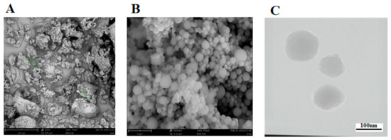 SEM was used to perform the morphological characterization of the developed NPs (Figure 3). Figure 3A demonstrates the image of the free artemether in 400× magnification and Figure 3B shows the image of the encapsulated artemether (50,000× magnification). The free artemether seems to have an unorganized shape, while the nanoparticles are seen in a round shape with a smooth and regular surface. Additionally, the round shape of nanoparticles with a size of less than 200 nm was evidently confirmed by the TEM micrograph image (Figure 3C). Previous studies show that albumin nanoparticles that have a spherical shape and their size In the range of 50 to 300 nm, they are suitable for drug delivery [41,42].