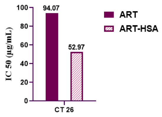 MTT assay was performed for analyzing the in vitro cytotoxic effect of ALB-ART NPs on colon cancer cell line (CT26 cell line) (Figure 5). For this purpose, CT26 Cells were treated with various concentrations of artemether in the form of free and encapsulated artemether for 24, 48 and 72 h periods. As a control group, MNCs were treated with the same dose of drugs for the same period. The results of the MTT assay are shown in Figure 4. As observed, at 48 and 72 h, at all concentrations, the cytotoxicity effect of encapsulated artemether was significantly greater than the free artemether. Unlike the cytotoxicity effect of free artemether, which does not increase much after 48 h, the cytotoxicity effect of nanoparticles increased after 48 h, so that at the end of 72 h, cell survival decreased to about 50%. Moreover, the maximum effect of artemether at 72 h and in 50 μg/mL concentration was due to nanoparticle formulation which had a statistical difference with the free artemether (p < 0.0001). According to the results, the half-maximal inhibitory concentration (IC50) value of free and encapsulated artemether was calculated (Figure 6). The IC50 value was calculated as 52.97 μg/mL for nanoparticles and 94.07 μg/mL for free artemether.