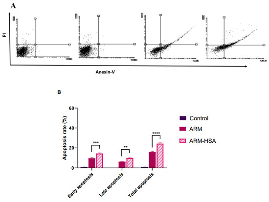 Annexin-V assay, based on cell membrane changes caused by apoptotic processes, is a widely used method for apoptotic analysis as well as discrimination between necrosis and apoptotic cell death [48]. For this purpose, CT26 cells and MNCs were seeded in a 12-well culture plate at a density of 1 × 105 and 106, respectively, and incubated for 24 h at 37 °C. After 24 h, cells were treated by an effective dose of ARM (50 µg/mL) and equivalent amount of ARM in nanoparticle formulation for 24 h. After incubation, cells were trypsinized and centrifuged (1500× g, 15 min at 4 °C) and the pellet was re-suspended in Annexin-V binding buffer. Then, 5 µL of Annexin-V FITC conjugate and 5 µL of PI (propidium iodide) were added to cell suspension and analyzed by flow cytometry.