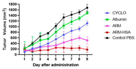 Tumor mice were divided into five groups receiving cyclophosphamide, albumin, PBS, free artemether and encapsulated artemether. They received drugs in 7 steps. The results of monitoring tumor growth over 2 weeks are shown in Figure 8. According to the figure, the fastest and highest tumor growth was in the PBS- and albumin-receiving groups, whereas the nanoparticle-receiving group demonstrated the slowest tumor growth compared to others.