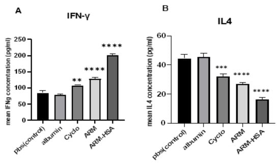 Results of IFNγ (A) and IL4 (B) secretion in five groups receiving PBS, albumin, cyclophosphamide, artemether and nanoparticles. Asterisks show the statistically significant difference between various groups. (** p < 0.01, *** p < 0.001, and **** p < 0.0001). The significance of data from each were compared to the control group.