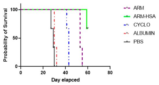 When the tumor size of the mice reached 200 mm3, treatment of the mice began. In the second stage, mice were divided into 5 groups (6 mice in each group) receiving free artemether, ARM-HSA NPs, Cyclophosphamide, albumin and PBS as a control group. Drugs were injected into tumor mice in 7 steps. At each injection stage, free and encapsulated artemether (both at a concentration of 10 mg/kg of artemether) were injected intramuscularly into each mouse [49]. PBS solution containing 5% ethanol was used to dissolve free artemether and PBS was used to dissolve nanoparticles. Tumor volume measurements were started one day before the first injection and was repeated every other day. After the drug injection steps, three mice from each group were kept for survival analysis. The tumor size of the mice was measured every other day for up to 60 days. For ethical reasons, mice with a tumor size of 2000 mm3 and above were considered dead, and mice with a tumor size of less than 2000 mm3 were considered alive.