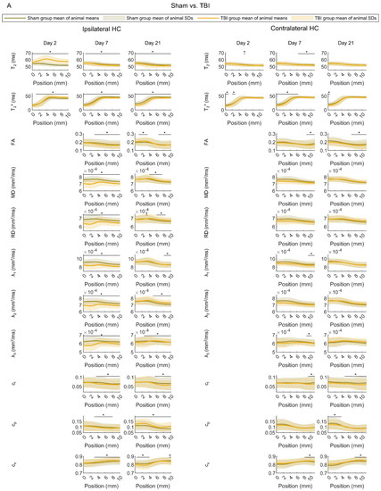 First, we investigated the differences in the distributions of individual MRI parameters along the septotemporal axis of the ipsilateral and contralateral hippocampus between the sham and TBI groups (Figure 5A).