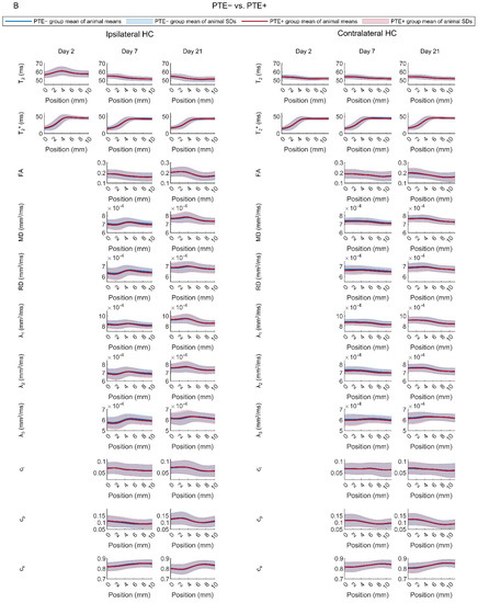 The contribution of hippocampal pathology to epileptogenicity can differ along the septotemporal axis in experimental models and humans with epilepsy [18,35,36,37]. The septal (posterior hippocampus in primates) rather than the temporal (anterior) hippocampus appears to be more involved in the formation of spatial memory. Furthermore, epileptogenic injuries such as TBI can affect the hippocampus bilaterally [15,17]. Therefore, we quantified T2, T2*, and DTI MRI parameters along the septotemporal axis of both the ipsilateral and the contralateral hippocampus. At various times after the injury, we examined whether it would be possible to predict if an animal would develop post-injury epileptogenesis. Therefore, we determined MRI abnormalities at both acute and subacute post-TBI time points (D2, D7, D21 post-TBI). It is during this time frame that the initial hippocampal vasogenic edema evolves and then subsides, and several secondary injury mechanisms (e.g., apoptosis, axonal injury) become activated [34].