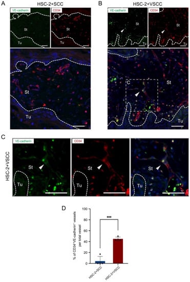 3.2. HSC-2+VSCC Xenograft Includes VE-Cadherin Expressed Vessels More Than HSC-2+SCC Xenograft