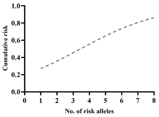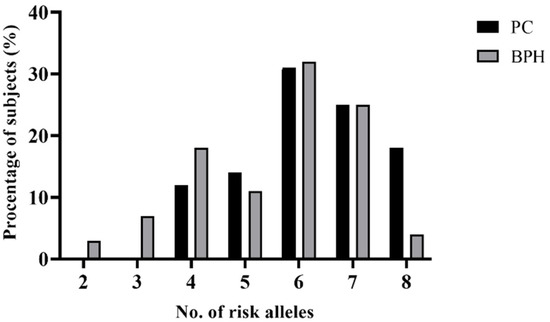 The risk for PC increased significantly with the number of risk alleles (Figure 2). The total risk of PC given by the combination of these four genetic variants was increased to 52%. Therefore, individuals carrying all eight risk alleles of the four SNPs tested had a 1.5-fold increased risk for developing PC compared with the BPH group (OR = 1.49, 95%CI: 1.11–2.10, p = 0.0058).