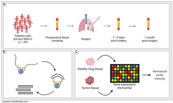 Schematic figure of study workflow. (A): Sampling-29 patients with primary non-small cell lung cancer (NSCLC) were included and blood plasma was sampled at three timepoints; before surgery, 3–5 days post-surgery, and 1 month post-surgery. (B): Olink’s proximity extension assay (PEA) technology was used to quantify the proteins in the plasma samples. (C): Validation-Protein expression patterns in plasma were validated with microarray data from NCBI’s GEO DataSets website.