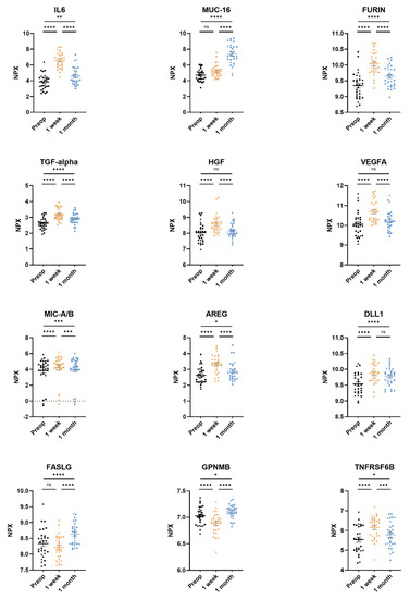 Pairwise comparisons of preoperative, 3–5 days post-surgery, and 1 month post-surgery samples for every protein in the assay revealed significantly elevated plasma levels of six proteins (AREG, DLL1, furin, IL-6, TGFα, and TNFRSF6B) in both the 3–5 days post-surgery and the 1 month post-surgery samples compared to the preoperative samples. Furthermore, the plasma levels of the proteins MUC-16 and VEGFA were also elevated but did not reach significant levels compared to samples preoperatively vs. 3–5 days for MUC-16 and preoperatively vs. 1 month for VEGFA (Table 2).