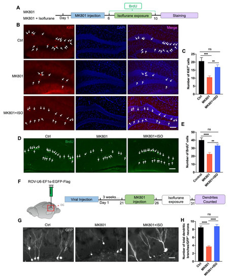 Isoflurane treatment reverses NSCs adult neurogenesis deficit in the DG induced by MK801. (A) Schematic of BrdU injection. BrdU was injected twice a day during 5 days of isoflurane exposure. (B) Representative photomicrographs showing Ki67-positive cells in the DG, indicated by white arrows. Scale bar, 100 μm. (C) Isoflurane inhalation reversed the reduction of Ki67-positive cells in the DG induced by MK801 (five mice in each group and five sections in each animal were picked and counted. One-way ANOVA, F(2, 29) = 9.306, p = 0.0008; post hoc test: Ctrl vs. MK801, p = 0.0005; MK801 vs. MK801+ISO, p = 0.009; Ctrl vs. MK801+ISO, p = 0.08). (D) Representative photomicrographs showing BrdU-positive cells in the DG, indicated by white arrows. Scale bar, 100 μm. (E) Isoflurane inhalation reversed the reduction of BrdU+ cells in the DG induced by MK801 (five mice in each group and five sections in each animal were picked and counted. One-way ANOVA, F(2, 28) = 15.33, p < 0.0001; post hoc test: Ctrl vs. MK801, p < 0.0001; MK801 vs. MK801+ISO, p = 0.0012; Ctrl vs. MK801+ISO, p = 0.051). (F) Schematic of retrovirus injection. Retrovirus was micro-injected into the DG 21 days before MK801 injection. (G) Representative images of the dendrites of newborn dentate granular cells. Scale bar, 10 μm. (H) The reduction of dendritic branches of newborn dentate granular cells reversed by isoflurane treatment (five mice in each group and five sections in animal were picked, and three cells of each section were analyzed and counted. One-way ANOVA, F(2, 39) = 62.68, p < 0.0001; post hoc test: Ctrl vs. MK801, p < 0.0001; MK801 vs. MK801+ISO, p < 0.0001; Ctrl vs. MK801+ISO, p = 0.62). Data are represented as mean ± SEM, ** p < 0.01, *** p < 0.001, **** p < 0.0001, ns, not significant.