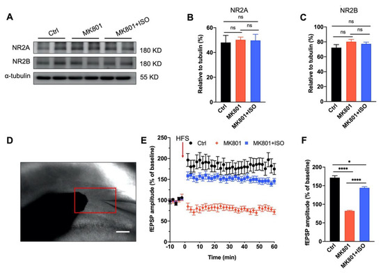 MK801-induced synaptic plasticity deficit in the DG can be reversed by isoflurane treatment. (A–C) Representative Western blotting images of proteins (A) and densitometric quantification (B,C) for NR2A and NR2B in the DG. α-tubulin was used as the loading control (n = 3 mice per group. One-way ANOVA, F(2, 9) = 9.306, p = 0.062; post hoc test: Ctrl vs. MK801, p = 0.73; MK801 vs. MK801+ISO, p = 0.92; Ctrl vs. MK801+ISO, p = 0.83 shown on B; One-way ANOVA, F(2, 9) = 1.588, p = 0.256; post hoc test: Ctrl vs. MK801, p = 0.16; MK801 vs. MK801+ISO, p = 0.48; Ctrl vs. MK801+ISO, p = 0.31 shown on (C)). (D) Electrode configuration for the LTP recording in the DG. The red rectangle indicates the stimulating electrode (left) and recording electrode (right). Scale bar, 100 μm. (E) LTP of local field potential in the DG after HFS induction at the perforant path. LTP was enhanced in the DG by isoflurane treatment after MK801 injection (n = 5 mice per group). (F) Quantitative analysis of data in (E). (Two-way ANOVA, F(2, 1260) = 713.5, p < 0.0001; post hoc test: Ctrl vs. MK801, p < 0.0001; MK801 vs. MK801+ISO, p < 0.0001; Ctrl vs. MK801+ISO, p < 0.05). Data are represented as mean ± SEM, * p < 0.05, **** p < 0.0001, ns, not significant.
