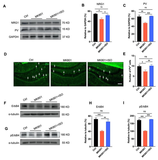 3.4. Isoflurane Inhalation Reverses PVIs Reduction and the Aberration of NRG1-ErbB4 Signaling in the DG Induced by MK801