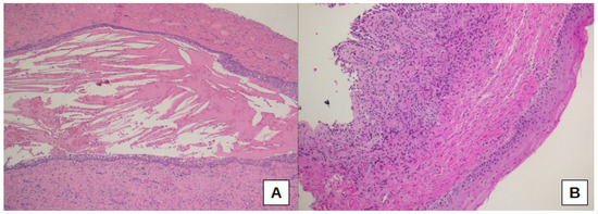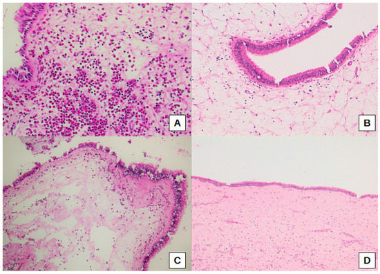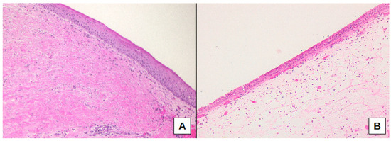 Thus, sub-epithelial edema was significantly different when comparing the three sub-cohorts of oCRS (p = 0.0099). Sub-epithelial edema was lower in oCRS cases with other tooth diseases than in cases with radicular cyst (difference of proportions −27.3%, 95% CI: −61.0%; −4.1%) or dental implant (difference of proportion −33.3%, 95% CI −70.1%; −6.5%) (Figure 2B,C). Figure 2D shows normal mucosa for comparison. Moreover, squamous metaplasia presence was significantly different between the three sub-cohorts (p = 0.0258). In particular, squamous metaplasia was more present in oCRS cases with radicular cysts than in those with a dental implant (difference of proportion 54.5%, 95% CI 14.9%; 83.3%) (Figure 3A,B).