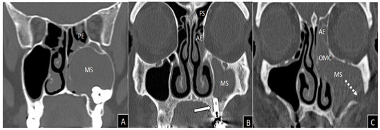 All patients underwent rigid nasal endoscopy (4 mm, 0°, and 30° telescopes) under local anesthesia. Furthermore, a radiological evaluation (both orthopantomography and paranasal sinuses computerized tomography [CT] scan) was performed to evaluate the presence of sino-nasal inflammation or anatomical alterations, such as nasal septum deviation or osteomeatal complex (OMC) alterations. The CT scan was also relevant to show the concomitant presence of odontogenic cysts (or other odontogenic disorders) and subclinical bone fistulas.