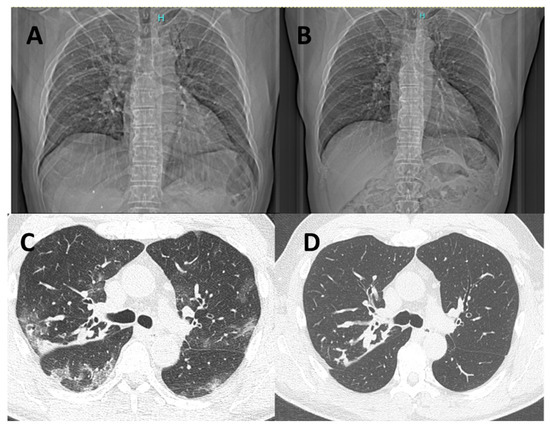 Chest X-ray and chest CT of a patient affected by COVID-19 in the acute phase of the disease (left, A,C) and after 6 months of follow-up (right, B,D). Chest CT shows radiological features of increased density and ground-glass opacities with peripheral and confluent distribution (C). The follow-up scan at 6 months documents complete resolution of COVID-related radiological findings, while peribronchial thickening and CF-related bronchiectasis remained unchanged (D).