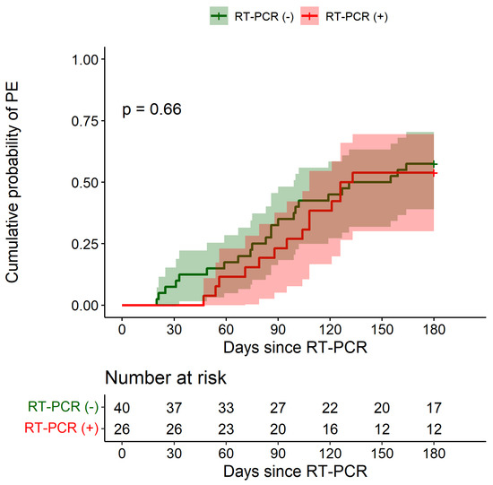 Six months after enrollment, respiratory function indicators had not significantly worsened in both groups (Table 3). Over the same period, PE occurred in 23/40 RT-PCR negative patients (follow-up data not available in 2 patients) and in 14/26 RT-PCR-positive subjects. Figure 2 shows the cumulative probability of PE among RT-PCR-positive patients and among those with a negative test. The 6-month cumulative probabilities were 0.538 (95% CI: 0.301–0.695) in RT-PCR-positive patients and 0.575 (95% CI: 0.391–0.704) in RT-PCR-negative patients. No significant differences emerged between groups (HR: 0.86, 95% CI: 0.44–1.68, adjusted HR: 0.88, 95% CI: 0.44–1.75).
