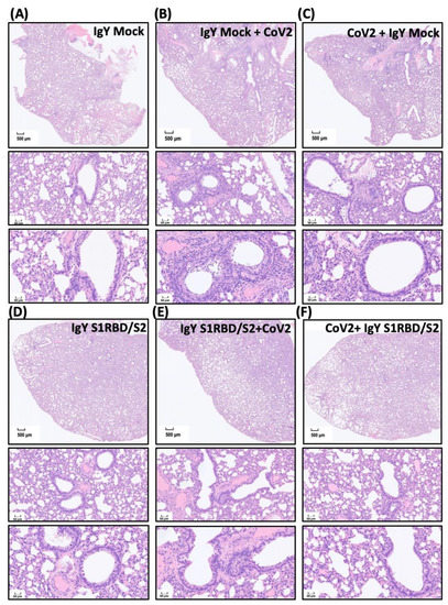 Next, we evaluated SARS-CoV-2-induced lesions and treatment efficacy of IgY antibodies in vivo. Mock IgY treatment alone had no effect on lung section morphology, as observed by hematoxylin and eosin (H&E) staining (Figure 5A). IgYs were delivered 1.5 h before or after intranasal challenge with SARS-CoV-2 (1000 pfu, Wuhan strain). Intranasal delivery of SARS-CoV-2 resulted in multifocal to coalescent areas of consolidation in lung sections, accompanied by inflammatory cell infiltration. In addition, neutrophil, macrophage, and lymphocyte infiltration were mainly found in perivascular areas. Pre-treatment (Figure 5B) or treatment with mock IgY after viral infection (Figure 5C) did not modify the pathological changes observed in the lungs of Syrian hamsters (Figure 5B,C). The patchy distribution of high cellularity indicating inflammatory cell infiltration is seen around bronchioles proximal to the bronchus in groups B and C. Significant lymphocytic–neutrophilic infiltration (Figure 5B) and perivascular edema (Figure 5C) are found under a high-power field with neutrophilic adhesion to the bronchial epithelium within the lumen (Figure 5B). Necrotic changes of epithelium and cell debris within the bronchial lumen are noted (Figure 5C). Lymphocytic adhesion to endothelium and perivascular edema suggest vasculitis (Figure 5C). The interstitial and alveolar space of groups A and D appears homogeneous. As per the body weight data, intranasal and intraperitoneal delivery of IgYs specific for S1-RBD and S2 subunits in uninfected hamsters did not induce any detectable histological changes (Figure 5D). Notably, pre-treatment (Figure 5E) or treatment (Figure 5F) with a combination of IgYs specific for S1-RBD and S2 subunits ameliorated the pulmonary insults caused by SARS-CoV-2 infection (Figure 5E,F). Meanwhile, we also requested the assistance of a pathologist to quantify these pathological lesions and calculate the pathological score based on various parameters, including necrosis of bronchial epithelial cells, bronchiointerstitial mononuclear inflammation, lung consolidation, perivascular lymphocytic cuffing, and perivascular edema (Figure 5G). The SARS-CoV-2 infection prominently increased indicated pathological scores which were not affected by IgY Mock pre-treatment nor post-treatment. Pre-treatment or treatment of the combination of IgYs specific for S1-RBD and S2 subunits robustly reduced lung pathological changes (Figure 5G).