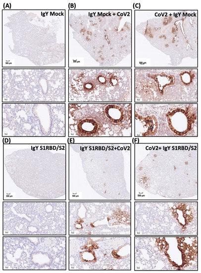 Owing to the expression of endogenous ACE2 expression, Syrian golden hamsters were used as the in vivo model for SARS-CoV-2 infection. The in vivo experiments were conducted as described previously [27] and approved by the Institutional Animal Care and Use Committee (IACUC) of the National Defense Medical Center Laboratory Animal Center (AN-110-15 and AN-110-16). Eight-week-old male Syrian hamsters were purchased from the National Laboratory Animal Center (Taipei, Taiwan). To infect the Syrian hamsters, 1000 pfu of SARS-CoV-2 (Wuhan strain) were delivered intranasally. IgYs specific for S1-RBD and S2 subunits were mixed and given simultaneously via the intranasal and intraperitoneal routes to neutralize SARS-CoV-2 infectivity in the nasal cavity and in the circulation. Syrian hamsters were treated with IgY antibodies 1.5 h before or after SARS-CoV-2 infection. Syrian hamsters were randomly separated into 6 groups: (A) IgY Mock; (B) IgY Mock + CoV2 (IgYs were given 1.5 h before viral infection); (C) CoV2 + IgY Mock (IgYs were given 1.5 h after viral infection); (D) IgY S1-RBD/S2; (E) IgY S1-RBD/S2 + CoV2 (IgYs were given 1.5 h before viral infection); (F) CoV2 + IgY S1-RBD/S2 (IgYs were given 1.5 h after viral infection). Each group contained at least three hamsters. After infection and the administration of IgYs, the body weight of Syrian hamsters was monitored for 7 days. On day 4 post-infection, lung sections were subjected to H&E staining and immunohistochemistry. Since the SARS-CoV-2 spike (S) protein tightly interacts with ACE2 after viral infection, this marker is seldom assessed in SARS-CoV-2-infected host cells. Syrian hamsters were challenged by SARS-CoV-2 in animal biosafety level 3 (ABSL-3) laboratories. Considering the high infectivity and biohazards of SARS-CoV-2, we only examined the changes in body weight and the expression of SARS-CoV-2 nucleocapsid, a viral protein implicated in SARS-CoV-2 replication protein after viral infection. The Syrian golden hamster model for in vivo SARS-CoV-2 infection is highly reproducible and routinely conducted in our laboratory. All animal procedures complied with the ARRIVE guidelines (https://arriveguidelines.org/ (31 December 2020) and were reviewed and approved by the Institute of Preventive Medicine, National Defense Medical Center Animal Care and Use Committee (approval numbers: AN-110-15 and AN-110-16)