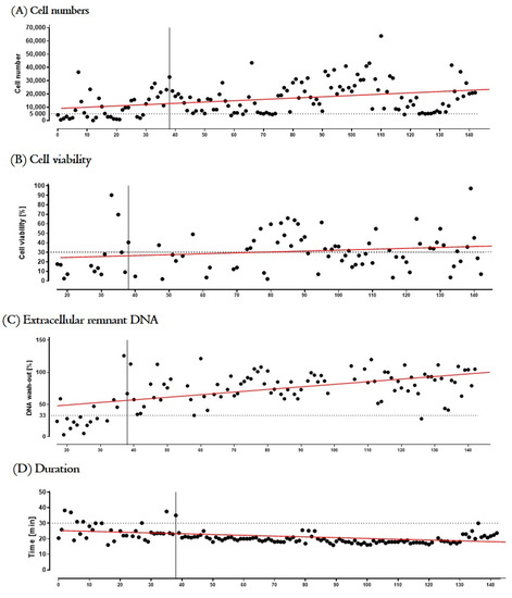 | Remnant extracellular DNA (%) | 33 | 82.74 ± 22.98 | 26 (78.8) | 20 | 74.8 ± 24.2 | 15 (75.0) | 34 | 80.9 ± 19.3 | 32 (94.1) |