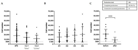 | Cell number | Neubauer chamber: counting | ≥5000 cells | Continue production | Continue production; open a deviation |