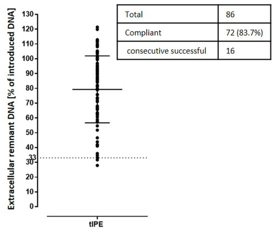 | Remnant extracellular DNA | Qubit dsDNA assay, fluorimetric | ≥33% | N.A. | N.A. (not measured) |