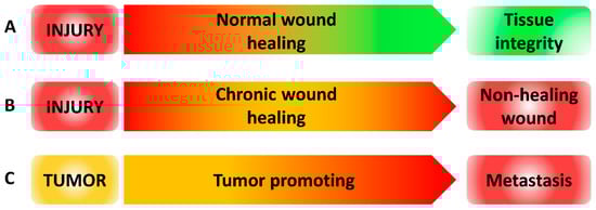 ROS levels during wound healing and metastasis. (A) ROS level during normal wound healing. After injury, high levels of ROS (red) are produced and then decreased to low level (green) over time to restore tissue integrity. (B) ROS level during chronic wound healing. After injury, high levels of ROS (red) are produced and failed to be reduced inducing non-healing wound. (C) ROS level during tumor progression. In tumor, ROS are produced in an intermediate level (orange). When ROS level increased, tumor progression is promoted leading to metastasis.