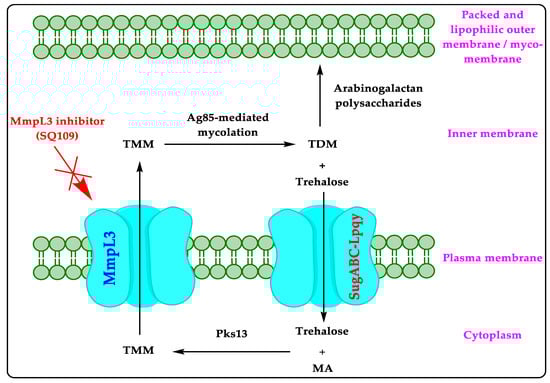 MmpL is a transport protein (trehalose monomycolate flippase) in Mtb. There are about 13 MmpLs, but only MmpL3 is essential in Mtb [14]. The physiological role, structure, and properties of MmpL3 are well described in the literature [14,15,16,17,18,19]. Mycolic acid (MA) is an essential component of the MA-based hydrophobic outer cell wall of Mtb [14,15,16,17,18,19]. MA is produced in the cytoplasm of the Mtb cell. In the cytoplasm of the Mtb, the type I polyketide synthase 13 (Pks13) drives the interaction of MA and trehalose to produce trehalose monomycolate (TMM). MmpL3 is located at the plasma membrane of the Mtb. MmpL3 is responsible for transporting TMM from the cytoplasm to the inner membrane of the Mtb. In the inner membrane, Ag85 mediates the conversion of TMM to trehalose dimycolate (TDM) and trehalose. The trehalose returns to the cytoplasm via the SugABC-Lpqy transporter to restart this cycle. The TDM makes the covalent bond with the arabinogalactan polysaccharides to synthesize a packed and MA-based hydrophobic outer cell wall of Mtb (Figure 1).
