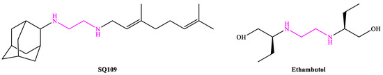 SQ109 (Synonym: NSC722041; Molecular Formula: C22H38N2; Molecular Weight: 330.55; CAS registry number: 502487-67-4; ChemSpider ID: 4438718; PubChem substance ID: 175426955; PubChem CID: 5274428; Figure 2) is a 1,2-ethylenediamine-based analog of EMB (Figure 2) [34,35]. The 1,2-ethylenediamine linker is essential for the anti-TB activity of SQ109 and EMB [36].