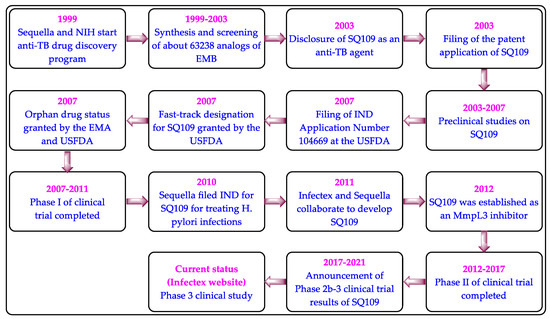 Infectex and Sequella are developing SQ109 in partnership to treat MDR pulmonary TB [37,38]. SQ109 was developed by focusing on EMB, but they share an uncommon chemical skeleton (Figure 2) and mechanism of action. The chemical structure, synthesis, anti-TB activity, oral bioavailability, and acid stability of SQ109 were first disclosed in 2003 [34,39]. The development timeline of SQ109 is presented in Figure 3.