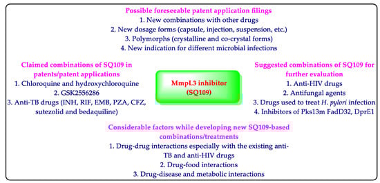 A company files patent applications to protect and get the commercial benefits of its inventions [42,43,77]. Sequella has also protected SQ109-based inventions related to the pharmaceutical compositions/combinations and methods of treating Mtb infections utilizing SQ109 [45,46,47,48] (Figure 4). Sequella’s patents/patent applications provide experimental details of the claimed SQ109 inventions. However, many patents/patent applications do not provide experimental details of the claimed compositions of SQ109 with other drugs [51,54,56,57,58]. Therefore, the authors recommend carrying out the experiments using the claimed combinations of SQ109 with other drugs provided in such patent applications [51,54,56,57,58] (Figure 4). This will help to identify more SQ109-based anti-TB combinations. The HIV-patients are prone to developing TB. SQ109 has demonstrated good activity against H. pylori and fungi. Therefore, the combinations comprising SQ109 and other drugs (anti-HIV and antifungal) may also be tested (Figure 4). The study of drug interaction helps to avoid pharmacokinetic and pharmacodynamic-related issues of a drug [42,43]. Accordingly, an assessment of the SQ109-based drug interaction studies is also necessary (Figure 4). A company can file different types of patents for a drug [12,77]. Therefore, the writers foresee the advance and patent filings of further SQ109-based inventions comprising new combinations of SQ109 with other drugs (anti-HIV, antifungal, and different antibiotics/antivirals), new dosage forms of SQ109 (capsule, injection, suspension, etc.), polymorphs of SQ109 (new crystalline or co-crystal forms), and new indications of SQ109.