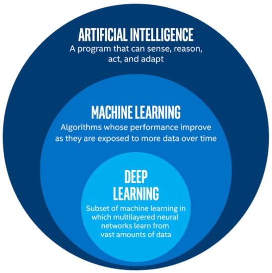 Deep learning is one of those remarkable advancements [9] that has rendered AI even smarter. Deep learning is the branch of machine learning that was named in 2006. It was inspired by the structure of the human brain, which contains neural networks. It is a data-processing method that uses a multiple-layer technique [10]. The working of the layers can be considered to be a layer receiving weighted input, transforming it into mostly nonlinear functions, and then sending the output to the next layer [11]. It is aiding in addressing issues that have limited the finest efforts in artificial intelligence for many years. It is excellent at finding complex structures in huge amounts of data; therefore, it is applicable to many fields of science, business, and government [12]. The relationship among AI, machine learning, and deep learning can be seen in Figure 1 [13,14].