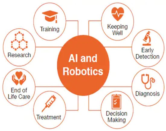 Robots are one of the most amazing AI inventions. Just like every aspect of life, robotics is increasingly becoming a part of medicine. AI and robots have vast potential in the healthcare sector. Figure 2 gives a glimpse of the contributions of AI and robotics in the healthcare sector [23]. AI is used by researchers to quickly and efficiently process and respond to data for better treatment outcomes of fatal ailments such as cancer and heart diseases [24].