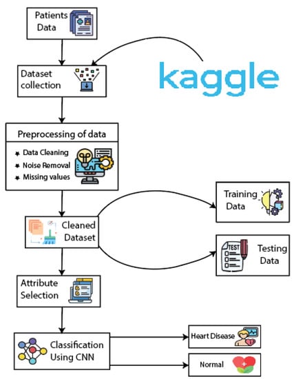 The dataset of the heart patients used for the proposed methodology is gathered from the University of California (UCI, Irvine C.A) repository, which is publicly available on the Kaggle website (https://www.kaggle.com/datasets/redwankarimsony/heart-disease-data, accessed on 15 June 2022). The dataset collected from Kaggle contained the information of 1050 patients, which included 76 attributes. Out of the 76 attributes, 14 were used for the prediction of heart disease. This is because the other attributes do not affect the disease as much as these attributes. To eliminate the missing and redundant values, the dataset is cleaned and filtered before being used for classification. The dataset was randomly divided into training and testing datasets with 80% and 20% of the samples, respectively. Out of 1025 patient records, 820 records were used for training, and the remaining 205 samples for testing. Training data were used for training the model with the CNN algorithm, and validation data were for validating the performance of the trained model.