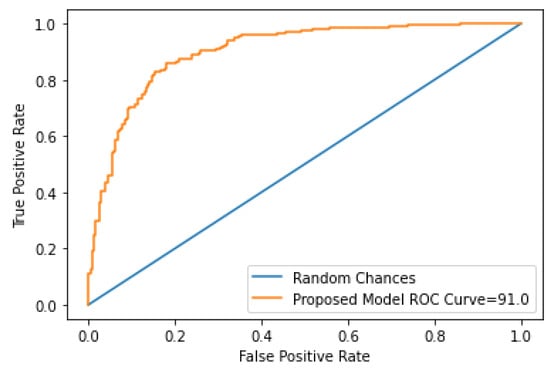 The performance of the classification algorithms is intrinsically linked with the area under the curve (AUC), i.e., the larger the value of the AUC is, the better the performance of the classification algorithm. The proposed model’s strength and robustness were evaluated using the ROC curve. The receiver operator characteristics curve of the proposed model is shown in Figure 8.