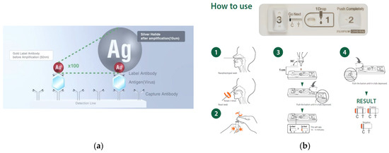 Details of the FUJIFILM COVID-19 Ag test. (a) The principle of silver amplification technology: colloidal gold particles are amplified approximately 100 times, increasing the detection sensitivity; (b) Instructions for using the FUJIFILM COVID-19 Ag test. Collected specimens were diluted with an extraction buffer in the tube included in the package, and one drop of the sample was added onto the sample well of the FUJIFILM COVID-19 Ag test. Button 2 was pressed immediately to release reducing reagents for the silver amplification. After the Go Next indicator mark turned orange (after about 10–15 min), button 3 was pressed to release Ag ions to activate the silver amplification reaction.