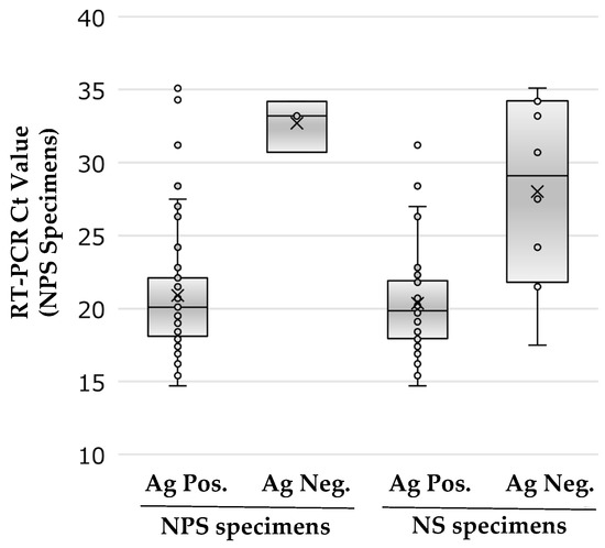 Table 5 lists the sensitivities of antigen tests of the NPS and NS specimens according to the Ct values of the NPS RT-PCR test (NIID N2 primer), and Figure 2 displays the distribution of Ct values for positive or negative specimens with the antigen test. The sensitivities of NPS specimens were 100%, 100%, 100%, and 50.0% and those of NS specimens were 97.0%, 88.0%, 83.3%, and 16.7% with Ct values of <20, 20–25, 25–30, and >30, respectively. For the NPS specimens, the sensitivity was 100% in specimens with a Ct value of ≤30, which was comparable to that of RT-PCR in the reference assay. In contrast, for NS specimens, the sensitivity was 92.2% in specimens with Ct values of ≤30, which was slightly lower than that for NPS specimens. Relationship between Ct values of RT-PCR and days after onset and their antigen rapid diagnostic tests are shown in Figure S1.