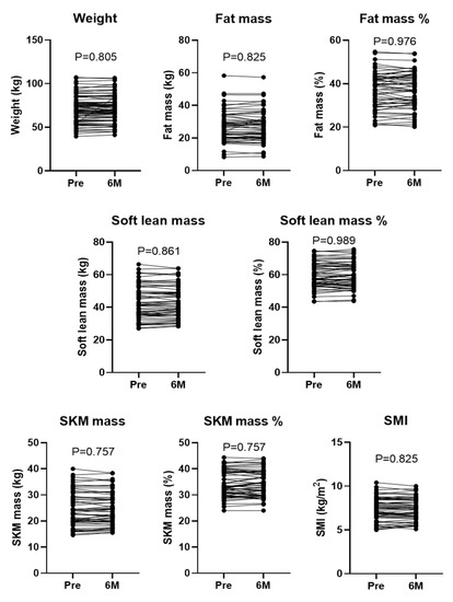 We ultimately enrolled 88 patients receiving PEM (0.1 mg twice daily) for HTG-NAFLD and examined the effects of PEM treatment for 6 months. The pretreatment clinical characteristics of the cohort are summarized in Table 1. Median age was 57 years, and 35 patients (39.8%) were men. Body composit.ion analysis revealed median body weight, body mass index (BMI), fat mass percentage (%), and SMI values of 71.9 kg, 27.2 kg/m2, 39%, and 7.4 kg/m2, respectively. Forty-one (47%) and 31 (35%) patients had DM and HT, respectively.