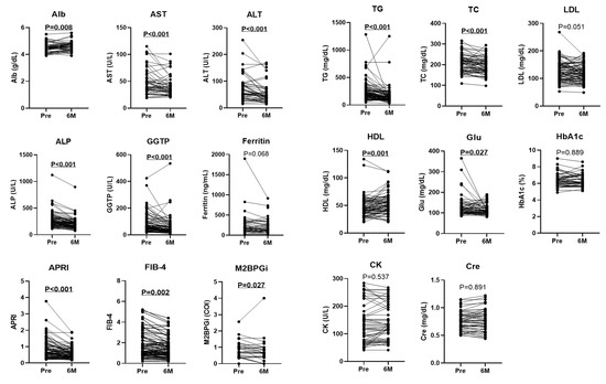 Laboratory data were evaluated before (Pre) and at 6 months (6 M) of PEM treatment. Data are from 47 patients for ferritin, 31 patients for M2BPGi, and 88 patients for the other parameters (Wilcoxon matched-pairs signed-rank test). Alb: albumin, ALP: alkaline phosphatase, ALT: alanine aminotransferase, APRI: aspartate aminotransferase to platelet ratio index, AST: aspartate aminotransferase, CK: creatine kinase, Cre: creatinine, FIB-4: fibrosis-4 index, GGTP: gamma-glutamyltransferase, Glu: fasting glucose, HbA1c: hemoglobin A1c, HDL: high-density lipoprotein cholesterol, LDL: low-density lipoprotein cholesterol, M2BPGi: Mac-2 binding protein glycan isomer, TC: total cholesterol, TG: triglyceride.