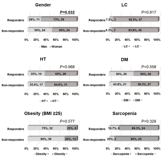 A response to pharmacological intervention was defined as a decrease in ALT of >30% compared with baseline after 6 months of PEM treatment according to several NAFLD clinical trials [21,22]. We compared the baseline clinical features of PEM responders (n = 40) and non-responders (n = 48) in HTG-NAFLD patients, including those who underwent body composition analysis. Responders had a significantly higher frequency of women than non-responders (73% vs. 50%, p = 0.032) (Figure 3). The presence of LC, HT, DM, obesity (i.e., BMI ≥ 25), or sarcopenia did not significantly affect PEM treatment response.