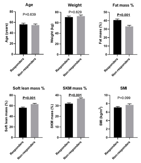 Comparison of baseline physical data of responders and non-responders to 6 months of PEM treatment (Mann–Whitney U test). SKM: skeletal muscle, SMI: skeletal muscle mass index.