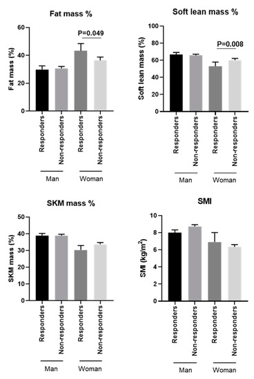 Lastly, a recent mouse study by Smati et al. uncovered a marked sex difference in hepatic gene alterations in diet-induced NAFLD, in which PPARα played an important role [32]. Similarly, the response to PEM treatment our cohort was higher in female than in male patients, thus supporting that a determinant of this response was PPARα in hepatocytes. Molecular signatures in the human liver also indicated a sex-differentiated gene expression profile and a sex-specific co-expression network of PPARα [32]. The high response of women to PEM in our study may be attributed to the sex differences in this PPARα co-expression network in the liver. It might even be argued that the gender difference in PEM responsiveness was the main contributing factor, while the difference in body composition was a singular cofounding one. However, as shown in Figure 5, there were significant differences in treatment responsiveness according to body composition even among female patients, and so variability in body composition might be meaningful when considering PEM treatment responsiveness.
