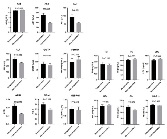 Comparison of baseline laboratory data of responders and non-responders to 6 months of PEM treatment (Mann–Whitney U test). Alb: albumin, ALP: alkaline phosphatase, ALT: alanine aminotransferase, APRI: aspartate aminotransferase to platelet ratio index, AST: aspartate aminotransferase, FIB-4 index: fibrosis based on four factors index, GGTP: gamma-glutamyltransferase, Glu: fasting glucose, HbA1c: hemoglobin A1c, HDL: high-density lipoprotein cholesterol, LDL: low-density lipoprotein cholesterol, M2BPGi: Mac-2 binding protein glycan isomer, TG: triglyceride, TC: total cholesterol.
