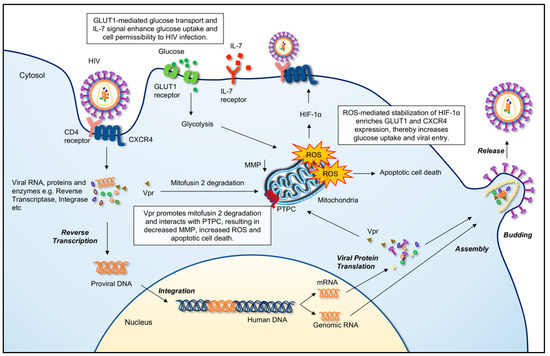 HIV infection causes metabolic alteration in the infected CD4+ T cell. During HIV infection, upregulation of the glucose transporter 1 (GLUT1) receptor and interleukin-7 (IL-7) signaling in T cells enhances glucose uptake and the glycolytic process, which promote viral entry through the CD4 receptor and C-X-C chemokine receptor type 4 (CXCR4). High glucose levels increase the generation of reactive oxygen species (ROS), which leads to the stabilization of the hypoxia-inducible factor 1-alpha (HIF-1α) molecule and increased expression of both GLUT1 and CXCR4, which are crucial elements in HIV infection. HIV-encoded Vpr protein promotes ubiquitin ligase degradation of the mitochondrial fusion protein mitofusin 2, causing disruption of the mitochondrial outer membrane and mitochondrial membrane potential (MMP) that leads to an increased level of ROS. Vpr also migrates to mitochondria, interacts with permeability transition pore complex (PTPC) molecules such as adenine nucleotide translocator (ANT) to form large conductance channels that trigger mitochondrial membrane permeabilization, thus resulting in a reduction of MMP and apoptotic cell death.
