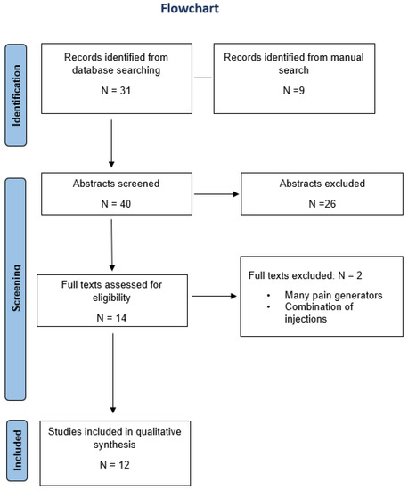 Inclusion criteria included randomized controlled trials, observational studies, and case series or reports that reported pain-related outcomes in patients with radiculopathy who received an epidural injection of PRP or other platelet-derived products. Exclusion criteria included review articles, animal studies, and non-peer reviewed publications or abstracts. Two independent reviewers (E.K., G.A.M.A.) selected abstracts and full-text articles from the aforementioned search strategies. Disagreements were resolved by a third reviewer (R.S.D.).