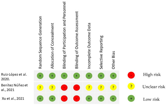 We used the Cochrane collaboration Risk of Bias tool to assess risk of bias in three RCTs [22,23,24] (Figure 2). Ruiz Lopez et al. had overall low risk of bias for all categories. Xu et al. had a high risk of bias in two categories which included blinding of participants and personnel and outcome assessment. Similarly, Benítez Núñez et al. had several concerns regarding high risk of bias in blinding of participants and personnel and outcome assessments, and unclear risk in other domains.