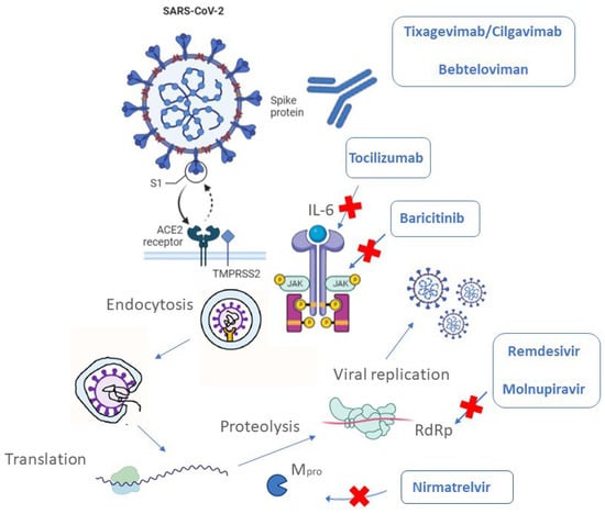 In response to viral replication, the immune system spurs effectors such as tumor necrosis factor (TNF)-α, interferon (IFN) and several interleukins (IL-1β, IL-6). In turn, a chain reaction is triggered in an attempt to resolve the infection. In particular, type-I IFN activates the janus kinase/signal transducer and activator of transcription (JAK/STAT) pathway, crucial for protecting against viral progression. The JAK/STAT axis is involved in cell proliferation and differentiation, apoptosis and the physiological process of the immune system [48,49,50]. JAK/STAT is also implicated in the aberrant immune response in SARS-CoV-2-infected respiratory epithelial cells with the activation of CD4+ and CD8+ positive T cells, NK cells, monocytes and the release of high levels of pro-inflammatory cytokines, representing an attractive target in COVID-19 patients. Furthermore, JAK-STAT activation promotes the senescence of SARS-CoV-2 infected cells, perpetuating inflammation. JAK inhibitors such as Baricitinib, Ruxolitinib and Tofacitinib have been developed. Baricitinib is an oral selective JAK1/JAK2 inhibitor that may block viral entry into host cells, prevent a cytokine storm, and resolve immune dysregulation in patients with SARS-CoV-2 pneumonia. An additional mechanism related to baricitinib is AP2-associated protein kinase 1 (AAK1)/cyclin G-associated Kinase (GAK) inhibition that contributes to preventing SARS-CoV-2 entry and intracellular virion assembly [51]. Several studies assessed the efficacy of baricitinib as the observational, longitudinal trial (IMMU-NOVID) (NCT04438629) which observed a significant reduction in IL1β, IL6, TNFα, recovery of circulating T and B cells and increased antibody production against the spike protein following baricitinib delivery. This was associated with a reduction in the need for oxygen therapy, pointing out the capacity of baricitinib of preventing disease progression [52]. Baricitinib reduced SARS-CoV-2 viral load, COVID-19 mortality rate, and intensive care unit admissions of COVID-19 pneumonia in a retrospective study (NCT04358614) [53]. A randomized phase III trial (COV-BARRIER, NCT04421027) described a significantly reduced mortality at 28 days and 60 days after baricitinib plus SOC. Finally, the clinical trial (NCT04401579, ACTT-2) found that the association baricitinib with remdesivir was superior to remdesivir alone in reducing the median time to recovery, and accelerating improvement in clinical status at day 15 but did not detect greater differences in mortality [54]. An ACTT-4 trial evaluated the association of baricitinib-remdesivir compared to dexamethasone-remdesivir, finding a significant efficacy for both treatments. Based on these results, baricitinib was approved by FDA for EUA along with remdesivir; moreover, it is strongly recommended for severe cases, especially in patients receiving corticosteroids baseline [55]. Baricitinib is also licensed as an alternative treatment to the IL-6 inhibitor tocilizumab if the latter is not available. Tocilizumab is able to block the IL-6 soluble and membrane receptor, approved for severe forms of COVID-19, characterized by the overproduction of proinflammatory cytokines. Recently, large-scale clinical trials and a meta-analysis demonstrated that Tocilizumab was beneficial in critical COVID-19 patients. In particular, the RECOVERY and REMAP-PAC trials analyzed the impact of tocilizumab in patients with clinical evidence of progressive COVID-19, discovering the ability of tocilizumab to improve survival and decrease the need for mechanical ventilation and mortality. The beneficial effects were more significant when tocilizumab was combined with corticosteroids [56,57].