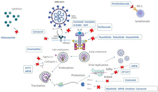 A recent phase II clinical trial (NCT05047783) (Table 1) has been testing the efficacy of Mpro inhibitor Masitinib, at three different dosages (last update of 23 June 2022). The ability of Masitinib in inhibiting Mpro (Figure 2) and reducing viral shedding of SARS-CoV-2 was investigated once again in patients with symptomatic mild-to-moderate COVID-19, supporting the use of oral antiviral agents in the early disease [66]. Many other clinical trials are focused on molecules targeting host genes since these latter have a low propensity to mutate than viral genes. Hence, antiviral drugs targeting host proteins may offer a good option compared to those targeting viral proteins. In fact, the transmembrane protease serine 2 (TMPRSS2) represents a potential therapeutic target [67]. TMPRSS2 mediated one of the two proteolytic cleavages involved in membrane fusion following ACE-2/spike interaction. TMPRSS2 inhibition could represent a strategy to block viral entry. Camostat mesylate (CM), an inhibitor of TMPRSS2 (Figure 2), was tested in the randomized “Austrian Coronavirus Adaptive Clinical Trial” (ACOVACT), showing its capacity to significantly reduce the progression to mechanical ventilation or death and the time to clinical improvement in hospitalized patients compared to lopinavir/ritonavir (NCT04351724) (Table 1) [68]. Moreover, calpain is another host protein whose inhibition could lead to the suppression of viral entrance via endocytosis, maturation of the primary endosome to the secondary endosome and virus replication. In a mouse model of bleomycin lung injury (BLD-2660), an oral selective inhibitor of calpain (CAPN) 1, 2 and 9 called BLD-2660 (Figure 2), reduced IL-6 levels in bronchoalveolar lavage fluid and attenuated fibrosis damage [69]. Based on these data, a randomized phase II, placebo-controlled study assessed the efficacy of BLD-2660 in hospitalized COVID-19 subjects, assuming its ability to downregulate IL-6 and reduce potential long-term fibrosis and loss of pulmonary function resulting from SARS-CoV pneumonia (NCT04334460) (Table 1).